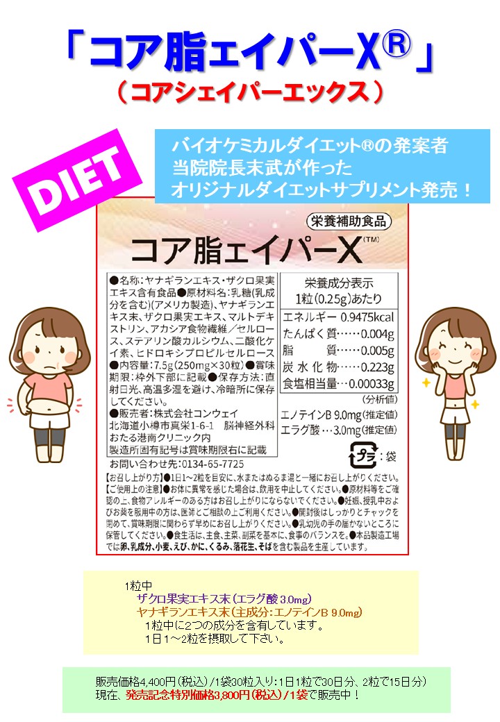 当院初のオリジナルサプリメント、OEM(Original Equipment Manufacturing)の発売を開始いたします。その名は「コア脂ェイパーX®」(読み方:コアシェイパーエックス)!
