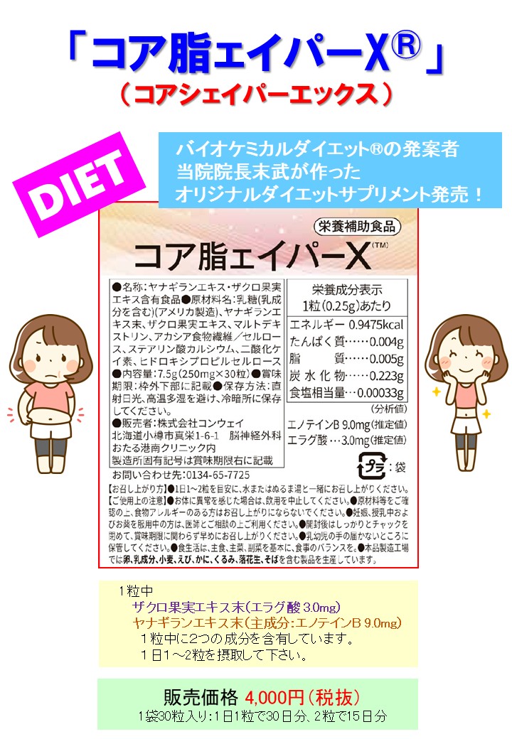バイオケミカルダイエット®はきちんと実践していただければ、達成期間の個人差はあれども結果は必ず保証します。これまでのブログで力説し続けているので読んでくださっている方はご理解いただけていると信じたいですが、バイオケミカルダイエット®は理にかなった最高の方法です(バイオケミカルダイエット®)。ですから、本気でダイエットに取り組みたいと考えている方にはバイオケミカルダイエット®しかお勧めしたくないのが本心です。とは言え、遠方の方は北海道小樽市まで受診することが困難であることや、血液検査や医療用サプリメントの購入などでお金がかかるという意見があることも事実で、自分はそのような方でもダイエットに取り組める何かを提供できないかともずっと考えてきました。そしてこの度、自分の知識を最大限に活用し、バイオケミカルダイエット®発案者である自分がオリジナルで作成したOEMサプリメント「コア脂ェイパーX®」を作りました。「コア脂ェイパーX®」は医療用サプリメントではありませんので、ネット注文でお菓子やジュースを買うのと同じように自由に買うことができるサプリメントです。但し、当院のこのサイトでしか買うことはできません。また、「コア脂ェイパーX®」は、バイオケミカルダイエット®に用いる栄養素は含まれていません。前稿(ブログ:エラグ酸の抗肥満作用)でお話しした、抗肥満作用を期待したエラグ酸とエノテインBを含有したサプリメントです。「コア脂ェイパーX®」は、バイオケミカルダイエット®とは全くの別物で、バイオケミカルダイエット®に比べると成果はもちろん劣ります。しかし、自分がそれなりに悩みぬいて考案しました。それなりに期待に応えることができるのではと思います。食事前に「コア脂ェイパーX®」を飲むだけです。食事制限はありません。だからと言って今まで以上に食べたらだめですよ(笑)。「コア脂ェイパーX®」の効果は、レプチン抵抗性やインスリン抵抗性の著しい高度肥満の方ほど出やすいと思います。ダイエット外来を行っていると、興味をもっていただける方は軽度肥満の方がほとんどです。高度肥満の方は諦めてしまっているのでしょうか?ダイエットをしたいけど、厳しい食事制限は嫌だという方、いかがですか?また、「コア脂ェイパーX®」はバイオケミカルダイエット®とは被りませんので、バイオケミカルダイエット®実践中の方も是非、ご使用ください!相乗効果が期待できるはずです。