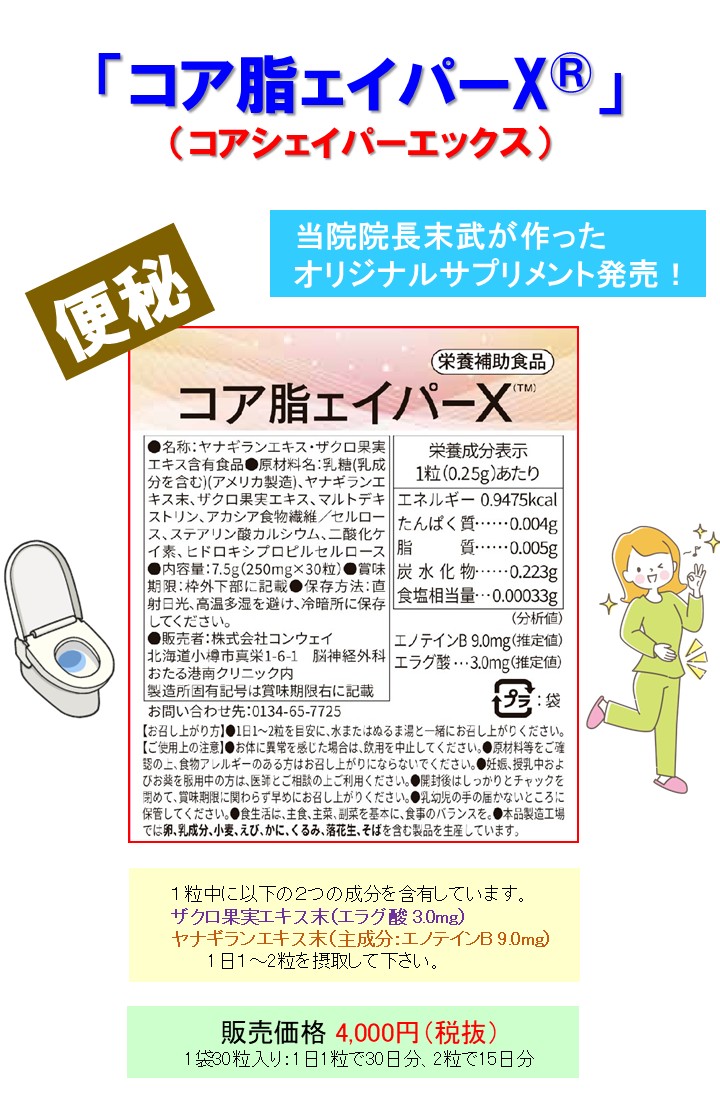 成分の一つであるヤナギランエキス末(ブログ:ヤナギランエキスの頻尿改善効果)に含まれる「エノテインB」には腸内の短鎖脂肪酸を産生する菌が増加するという報告も見られています。今まで便秘改善目的に、様々な腸内フローラを整えるサプリメントを駆使しても難治性であった便秘でお悩みの患者様がコア脂ェイパーX®だけで改善したという話を聞いて、その目的にも使えるのではないかと思いました。効果は比較的短期に、かなり高確率で自覚するようです。