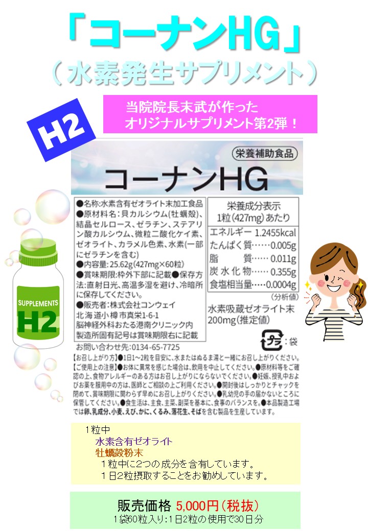 このような身体に良いサプリメントを多くの方に摂っていただきたいと思い、当院で、水素発生サプリメント「コーナンHG」の販売を開始しました。オリジナルダイエットサプリメントとしては「コア脂ェイパーX®」に引き続く、第2弾のオリジナルサプリメントです。