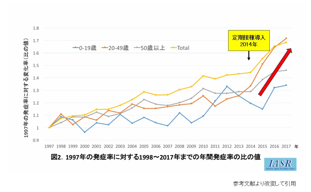 1997年からの全体の発症率は徐々に増加していますが、2014年10月の水痘ワクチン定期接種により、帯状疱疹の発症率は0~19歳で減少した一方で、20~49歳の若年層で大きく増加しています。これは、それまでの20~49歳の子育て世代では、水痘患児と接触する機会が多く、本人も子供自体の水痘罹患で終生免疫を持っているので、水痘に感染せずともウイルスに対する免疫ブースター効果が生じて、帯状疱疹が発症しにくい状況でした。ところが、定期接種において水痘患児が減少したことで、ウイルスによる外因性曝露が減り、免疫ブースター効果が得られずに帯状疱疹の発症が前倒しになってしまったからです。そのことから、水痘帯状疱疹ウイルスのワクチン接種が帯状疱疹の発症を予防できる可能性があるとなり、帯状疱疹予防のための水痘ワクチンが承認されることになりました。