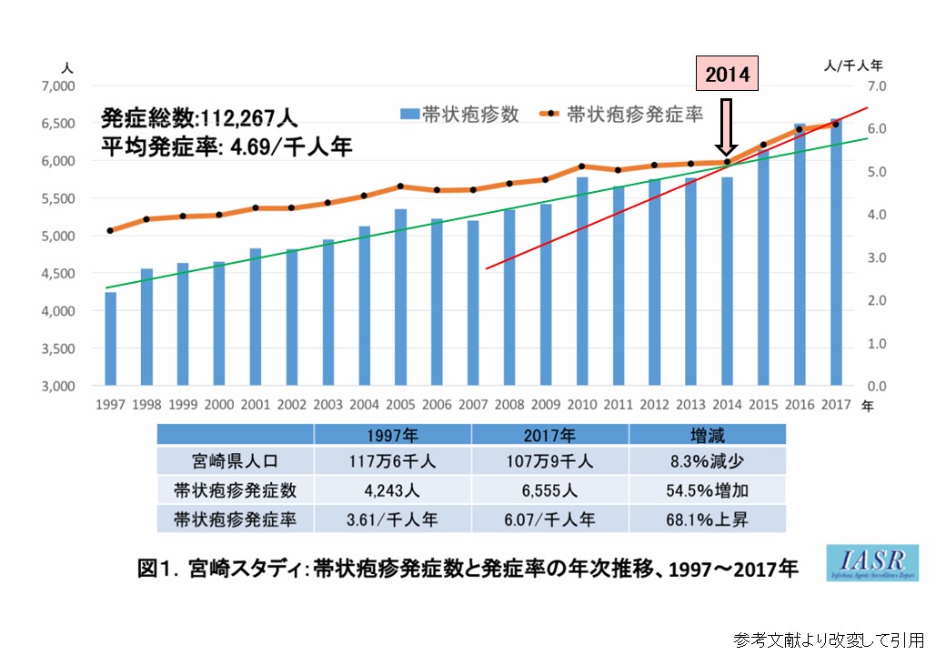 外山 望:帯状疱疹大規模疫学調査「宮崎スタディ(1997-2017)」アップデート.IASR 2018 年 8 月号; 39:139―141.